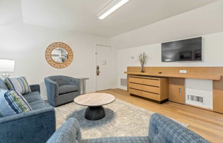 This deluxe suite hotel room is ideal for families or extended stays. With the extra living area, you’ll have plenty of space to spread out and feel comfortable. And with unlimited Wi-Fi and complimentary parking, you’ll have everything you need to stay connected and get around town without any hassle.
