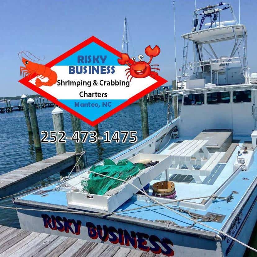 If you’re looking for a fun, hands-on activity that the whole family can enjoy together, hop aboard Risky Business for an Outer Banks shrimping and crabbing charter. Our experienced captain and mate will show your group how to pull crab pots to catch blue crabs and trawl for shrimp the same way that the local commercial fishermen do. You’ll learn about the species caught and how to sort through the catch – and everything of legal size is yours to keep for dinner! Along the way you’ll look for dolphins and other wildlife and see the sights in the Roanoke Sound and Croatan Sound. Based at Shallowbag Bay Marina in Manteo, our Outer Banks shrimping and crabbing charter is convenient to all the northern Outer Banks beach towns, only 5 minutes from Nags Head. We run charters in the summer only, from mid-June through September.